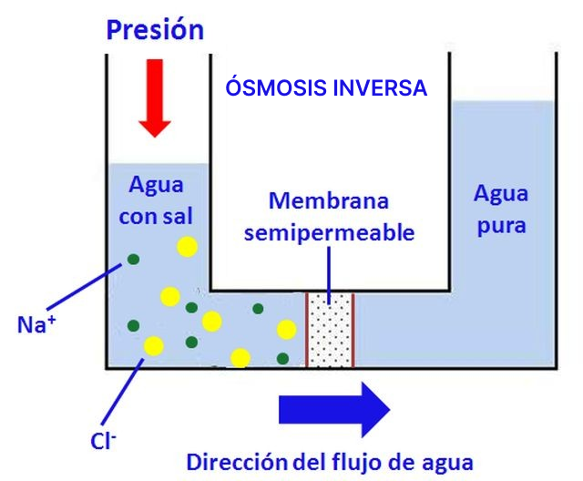 La ósmosis inversa (OI), en cambio, invierte este proceso natural. Mediante la aplicación de una presión hidráulica superior a la presión osmótica, se fuerza al agua a desplazarse en dirección contraria: desde la solución con mayor concentración de sales hacia la de menor concentración. Este principio es la base de los sistemas de ósmosis inversa utilizados en el tratamiento de aguas.